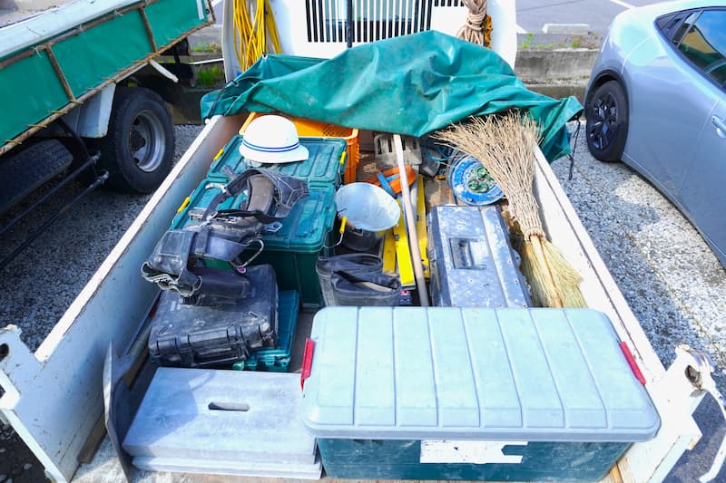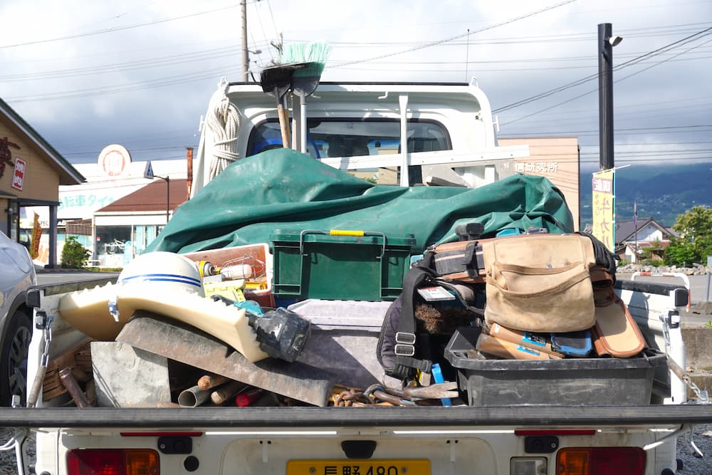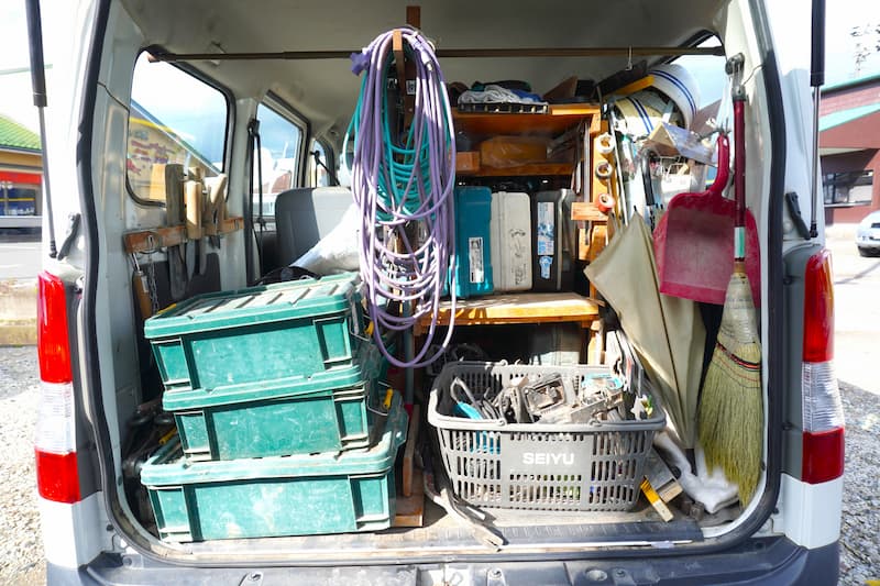 よく使う道具は、すぐに手が届く場所に。軽トラの荷台には、作業の流れを計算して道具を配置しています。