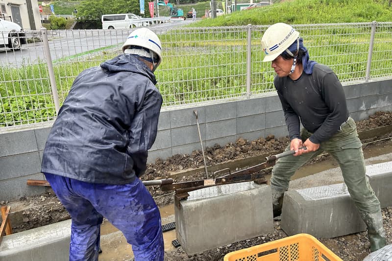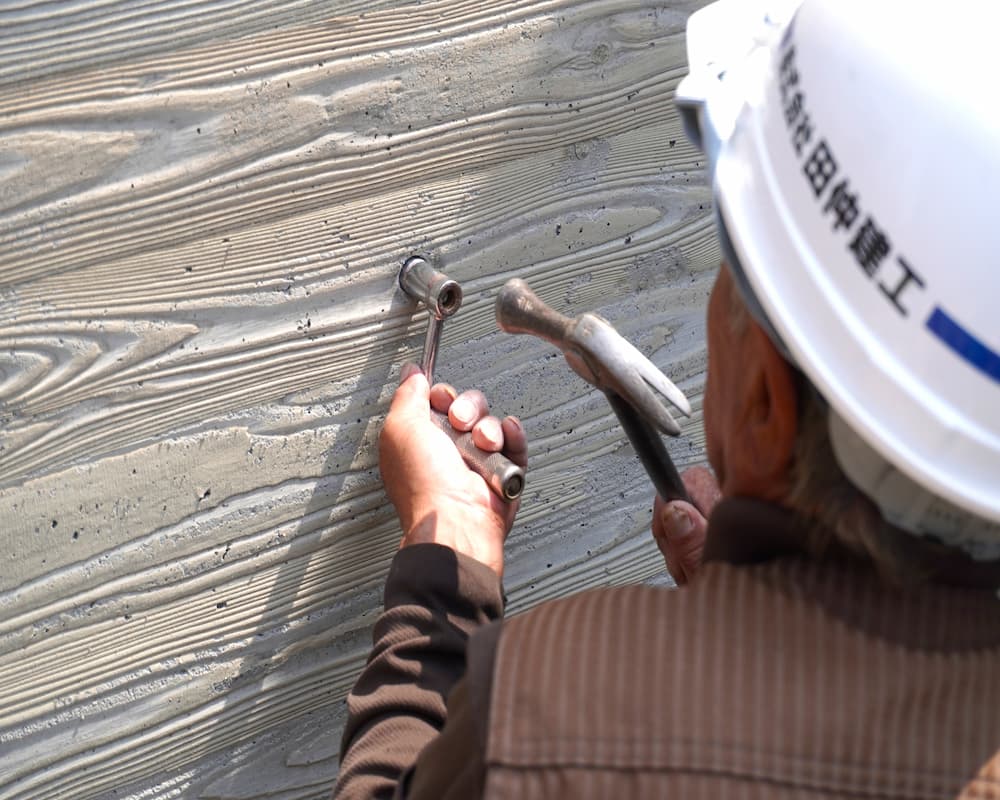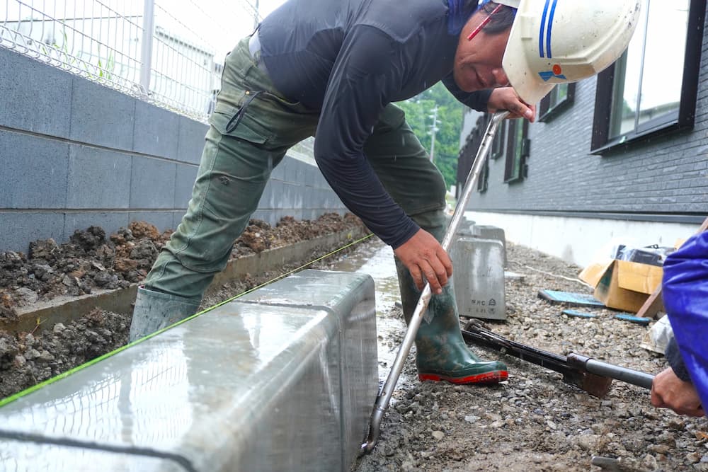 コンクリートを流し込んだ後、型枠の外側を木槌で叩いて振動を与えます。内部の空気を抜き、コンクリートを隅々まで生き渡らせることで、強度と見た目を均一に仕上げます。