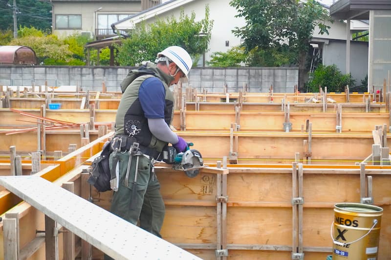 型枠や建物を支える金具をまっすぐ設置するため、水平器で角度や高さを確認しながら作業を進めます。傾きやズレを防ぎ、土台を正しくつくるのに役立ちます。
