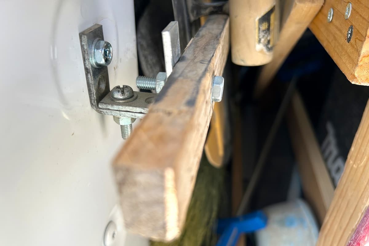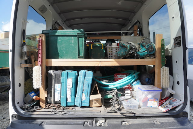 もともと車内についていたネジは市販のものに交換して、道具を引っかけられるようにアレンジ。こういう細かい工夫の積み重ねが、現場での動きやすさにつながっているのかもしれません。 -
