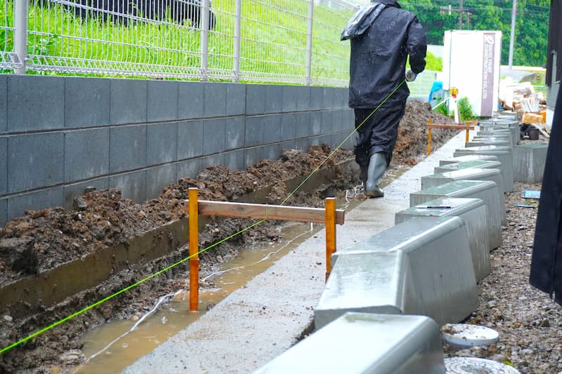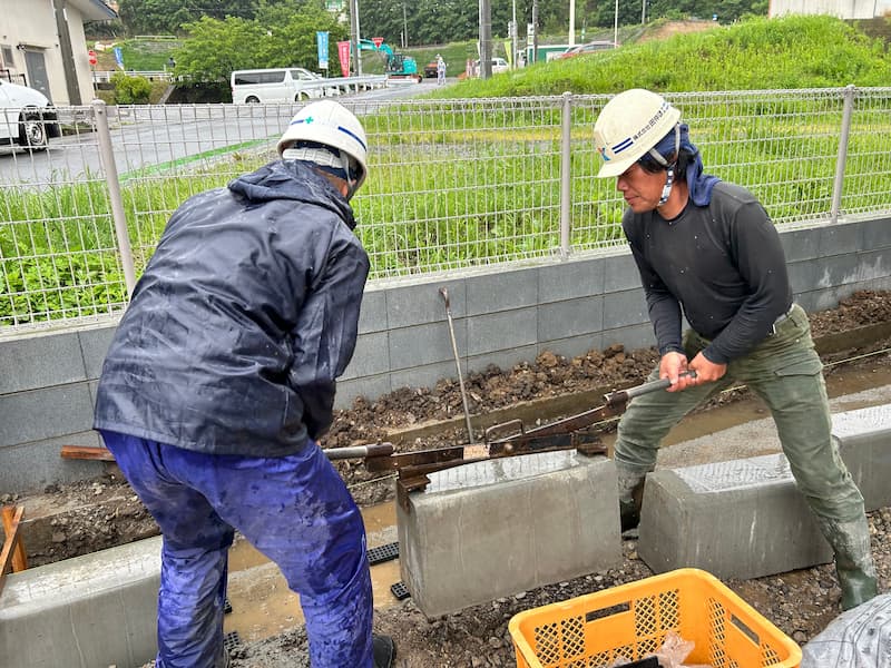 今日の主役は、高さ30cm×幅15cm、重さ80kgのブロック。重機で吊る人、一輪車で運ぶ人、受け取って設置する人――役割は違っても、目標は同じ。「まっすぐ、キレイに、速く」仕上げること。